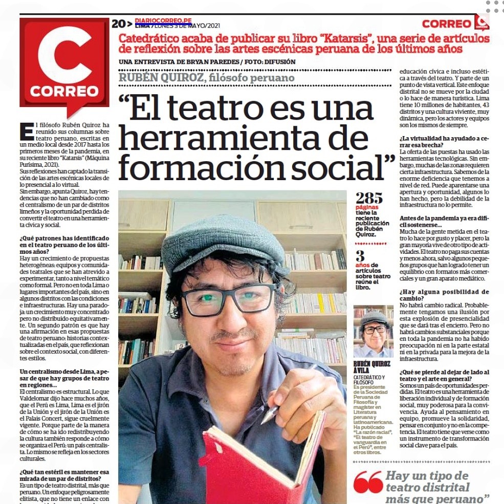«El teatro peruano requiere siempre ser repensado. Si no se reflexiona sobre los eventos escénicos es altamente probable que suceda la complacencia. Cualquier sensación de comodidad en el arte es peligrosa. Forja una sensación de molicie y puede llevar al fracaso intelectual y discursivo de toda producción escénica. Una comunidad excesivamente condescendiente detendrá su evolución artística. Es por ello que la labor del crítico de teatro es fundamental, en tanto, piensa el evento escénico como un asunto cultural compuesto de significados sociales y, por esa razón, hay que leerlo como una oportunidad de discernimiento de los sucesos contemporáneos a través de las puestas de escena.»